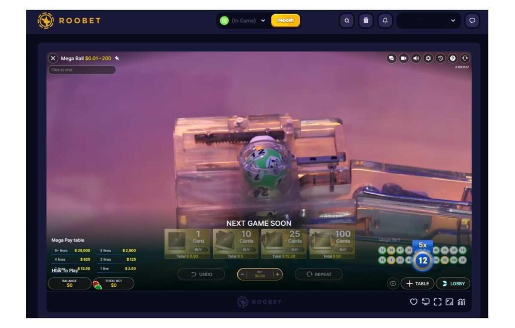 Roobet includes several of these interactive games in its live casino section. One popular example is Mega Ball, a live game show created by Evolution. The format blends lottery-style draws with live hosting, making the game easy to follow.